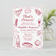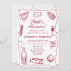 Whimsical and hand-drawn, this retro-style party design features a classic wine red color, a playful wavy frame, and illustrations of Italian-themed cuisine. Paired with elegant hand-lettered fonts, this design is perfect for adding a touch of vintage flair to your event. Ideal for rehearsal dinners, couple’s showers, or bridal showers—especially those with a pizza or pasta party theme.