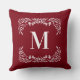 This monogram Christmas throw pillow features hand drawn white winter foliage that frames the monogram. The monogram and frame appear in white on a dark red background.
