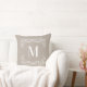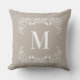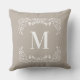 This monogram Christmas throw pillow features hand drawn white winter foliage that frames the monogram. The monogram appears in white on a light tan background.