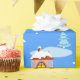 Hand drawn winter seamless pattern with cute Scandinavian houses,trees,snow,snow banks on blue background.