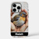 A vibrant phone case design featuring a colourful artwork of a bird held in hands, showcasing a personal touch with customisable text. Perfect for lovers of nature and individual expression.