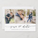 Pick the best pictures from your engagement shoot or your favourite pictures of the two of you for this perfect save the date. The words save the date are handwritten to give a personal feel to the card. The front has 3 images and the back has a large image with a white filter on top. Edit this save the date wedding card with your information and customise it for further for font and font colour options.