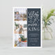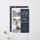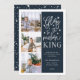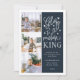Beautiful typography based holiday photo card features three of your favourite family photos in a square format along the left side. "Glory to the newborn king" appears on the right in white hand lettered typography on a rich navy blue background dotted with festive stars. Customise with your personal greeting, family names, individual names and the year. Cards reverse to a pattern of white snow and stars on a matching midnight blue background.