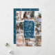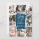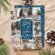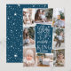 Beautiful typography based religious holiday photo card features eight of your favorite family photos arranged in a collage layout. "Glory to the newborn king" appears in the center in white hand lettered typography on a dark teal blue background dotted with festive stars. Personalize with your family name beneath.