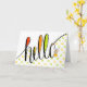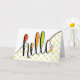 This is a cute card featuring the hand lettered word 'hello' and a tiny little illustrated who is waving. The mouse is sporting some chic checked yellow and orange shorts with braces, and orange rimmed glasses. A fun way to catch up with friends and family.
