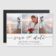Pick the best pictures from your engagement shoot or your favourite pictures of the two of you for this perfect save the date. The words save the date are handwritten to give a personal feel to the card. The front has 3 images and the back has a large image with a white filter on top.
