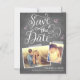 Whimsical and stylish save the date 2-photo announcement postcard featuring modern calligraphy script on a chalkboard background with photo snapshots.