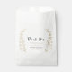 This whimsical wedding favour bag has a white background with customisable black and gold typography and hand-painted gold leaves and flowers.