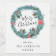 Elegant, holiday wine labels featuring "Merry Christmas" in a modern calligraphy script encircled by a watercolor wreath of pine branches, pinecones, and red Christmas ornaments. Personalise the festive holiday wine labels by adding a custom greeting and your name.