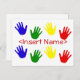 This cute little custom name hand print design is terrific for everyone young and old. It is colourful with blue green red and yellow hand prints.