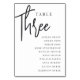 Simple and chic table number cards in classic black and white make an elegant statement at your wedding or event. Design features "table [number]" in an eyecatching mix of classic serif and handwritten script lettering, with individual guest names beneath. Design repeats on both sides. Individually numbered cards sold separately; order each table number individually from our collection.