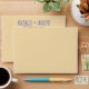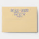 A retro modern hand written bright colourful wedding envelope. Which features bold bride and groom's names in blue colour. And personalised return address . On simple pale orange sandy vintage colour background. Which suits the whole wedding suite.