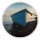 Handle of door, photograph of a boat at the edge of bay, with the sunrise. Titrate: “A boat in the small hour”, Iles-de-la-Madeleine, Quebec, Canada. Marie-Eve LaBadie photographer