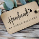 Rubber stamp featuring the text "Handmade" in a modern handwritten style script font with two cute hearts and your name below.