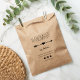Rustic chic kraft bags make beautiful packaging for your handmade, artisan or craft business. Design features two lines of custom text in black handwritten style block and script lettering, accented with a heart and arrow illustration. Personalise with two lines of contact information and your social media username. Shown with three social media icons.