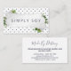 These simple business cards are for handmade, hand poured scented candles and soy wax melts. The design is simple but pretty with a fancy silver frame and white roses and navy blue dots in the background.