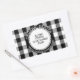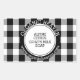 Rustic country, trendy black and white buffalo check product label stickers for branding- Classic country, black and white lumberjack plaid chequered pattern. Centre displays name of product displayed in white circle. Company name above in curved, modern lettering in matching white and bottom had custom business website address on the black circle border. Perfect for manly soaps for men, for branding your homey family business, country themes, rustic themes, and farmhouse product styles. Click Customise option to change text colours, size, and font styles. We have lots more soap product labels in our Zazzle.com/angela65* shop to mix and match for different soaps.
