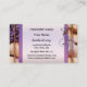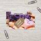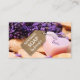 A business card featuring a heart shaped soap bar and lavender flowers with an optional label on the front. Beautiful for anyone who sells handmade soap or a spa, massage therapist or gift shop.