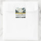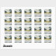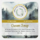 This beautifully designed sticker features a backdrop of a misty forest of coniferous trees with design elements of a round with text, and gold and white overlay band with text.