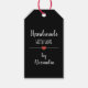 Modern "handmade with love" gift tag with a white font on a black background embellished by a cute red heart. Customise text.