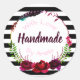 This sticker is a label for handmade items! Either stick it straight on the item or create your own round tag with this stuck on the front to give it an elegant look. Simply swap the existing name for your own. The design features watercolor floral roses, leaves and feathers on a black and white striped background..