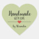 Modern "handmade with love" sticker with a black font on a sage green background embellished by a cute red heart. Customise text.