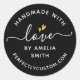 Round stickers with white hearts, the text "handmade with love" and your custom name and website URL or other custom text on a black background. The word "love" is written in an elegant calligraphy script font. Use as envelope seals, stickers for gifts and favours, product packaging etc. Follow us on Facebook: @businessstationery for more products, news, sales and more.