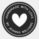 Round stickers with a white heart surrounded by the text "handmade with love" and your name or other custom text on a black background. Use as stickers for gifts and favours, product packaging etc.