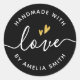 Round stickers with golden gradient (printed image) hearts, the text "handmade with love" and your custom name in white on a black background. The word "love" is written in an elegant calligraphy script font. Use as envelope seals, stickers for gifts and favours, product packaging etc. Follow us on Facebook: @businessstationery for more products, news, sales and more.