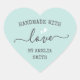 Light aqua blue, heart shaped stickers with the text "handmade with love" and your custom name. The word "love" is written in an elegant calligraphy script font and the rest of the text in a vintage typewriter style font. Use as envelope seals, stickers for gifts and favours, product packaging etc. Follow us on Facebook: @businessstationery for more products, news, sales and more.