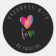 Beautiful “Handmade with love” sticker. White text and a colourful heart on a black background. Personalise it with your own name or text. If you need customisation help, please contact us and we will be happy to help you.