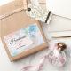 handmade with love stickers with beautiful blue flowers on a pink background. An image of a rectangle shaped notebook page layered over top for you to write your text inside.