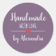 Modern "handmade with love" sticker with a white font on a purple background embellished by a cute red heart. Customise text.