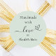 A sage green background, black text. Personalise and add your name. With the text: Handmade with love, by + a small heart.