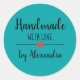 Modern "handmade with love" sticker with a black font on a teal background embellished by a cute red heart. Customise text.