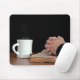 Folded hands in prayer on an old worn out Bible with white coffee mug.