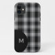 Handsome iPhone Case done in the black and white Macphee clan tartan plaid. A black half circle, on the bottom left side of the case has a single letter monogram ready to personalise, for yourself or as a great gift idea. Stylish way to protect your electronic device. Choose from glossy or matte finish.