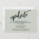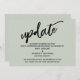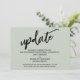 This suite's distinction is due to the modern, handwritten script font used for accent phrases. In the event that you need to let your guests know that your wedding has been cancelled, this card provides a bold, eye-catching option. In this piece, the hand-lettered script font was used to create a graphic simple depicting the word "update". Use the template fields to add your personal details and make this unique, modern design your own. The background can be changed to any colour you prefer. Please reach out with any special requests or for customising assistance. // 100 //