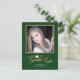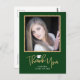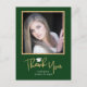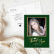 A simple graduation thank you postcard with a square photo accented with faux gold glitter border on a dark emerald green background. The design offers gold handwritten style text. The backside offers custom text for your own personal thank you message.