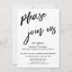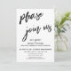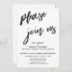 This suite's distinction is due to the modern, handwritten script font used for accent phrases. In this piece, the hand-lettered script font was used to create a graphic depicting the words "please join us". Use the template fields to add your personal details and make this unique, modern design your own. The white background can be changed to any colour you prefer. Please reach out with any special requests or for customising assistance. // 100 //