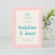 Retro inspired wedding save the date invitation in a bold retro colour palette of pink and turquoise, a wavy frame, with handwriting style fonts, a cute hearts illustration and "we say yes!" This is a fully customisable save the date template, all colours can be changed in the design tool if you like.