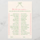 This coral pink and green bridal shower "would she rather" game sheet features a whimsical hand drawn green bow and handwritten casual font.