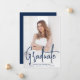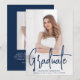 Modern graduation announcement featuring your vertical photo on the front with "Graduate" displayed in a handwritten navy script overlay. Personalise the front of the photo graduation announcement with the graduate's name, school name, and graduation year. The simple graduation announcement reverses to display an additional photo with space provided to include the graduate's plans, graduation details, etc. The 2 photo graduation announcement is perfect for both high school and college graduations!