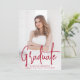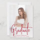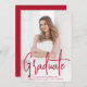 Modern graduation party invitation featuring your vertical photo on the front with "Graduate" displayed in a handwritten red script overlay. Personalise the front of the photo graduation party invite with the graduate's name, school name, and graduation year. The simple graduation party invitation reverses to display your party details in white lettering with a solid red background. The photo graduation party invite is perfect for both high school and college graduates!