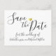 A stylish, simple and modern 'Save the Date' design with manuscript (handwritten font style) text, with the image of a small faux gold heart... and with custom lines of text...