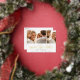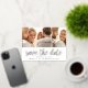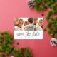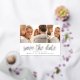 A modern photo collage save the date postcard designed to accommodate three of your favourite engagement photos side by side. "Save the date" appears beneath your photos in gold foil handwritten style script lettering, with your names, wedding date and wedding location beneath.