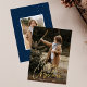 Modern holiday photo cards featuring your vertical photo with "Merry Christmas" displayed in a handwritten gold foil script. Personalise the foil Christmas photo card with your family name and the year in white lettering. The single photo holiday card reverses to display an additional photo and a navy background with subtle white dots.
