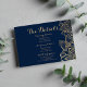 A modern elegant handwritten script lettering navy blue and gold hand-painted floral mandala theme wedding details card.