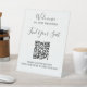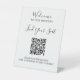 Elegant Handwritten script QR code elegant white wedding seating pedestal sign.