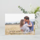 Stylish save the date photo announcement featuring rustic calligraphy scripts and stripes back.